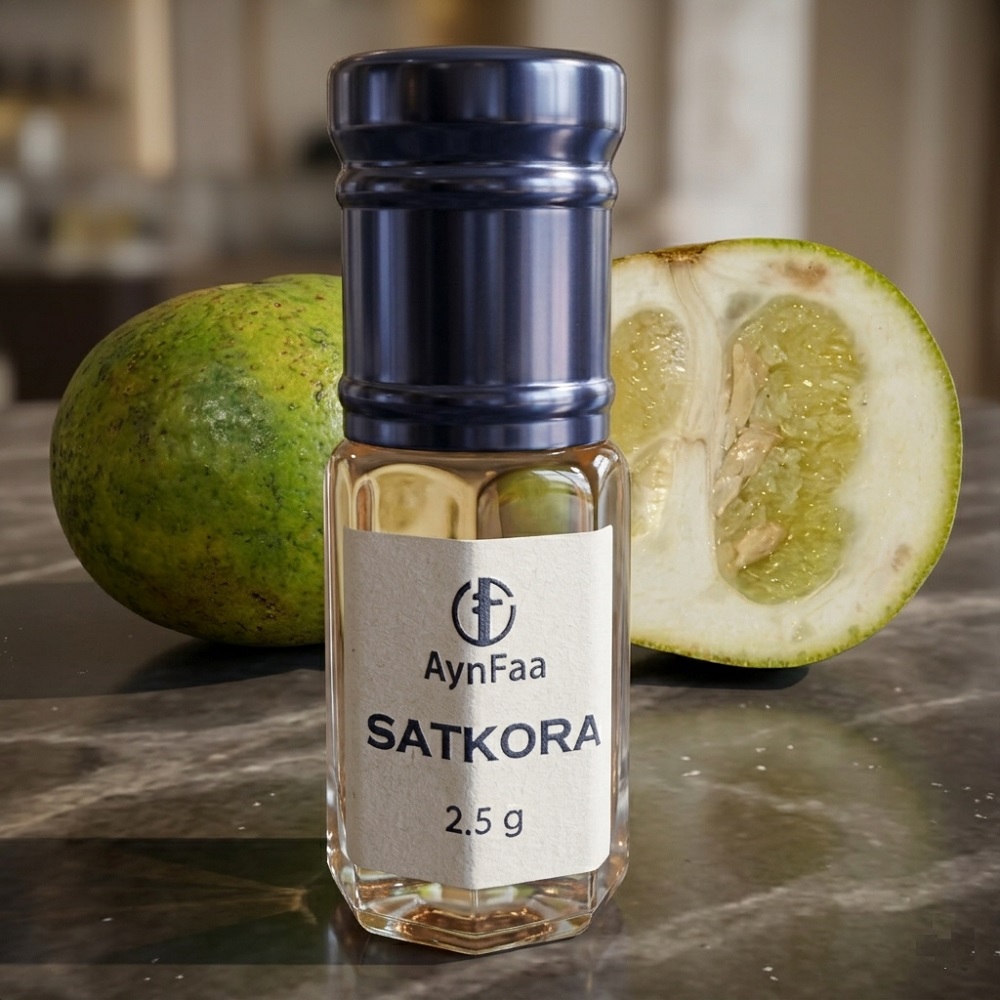 AynFaa Satkora attar is extracted by hydrosteam distillation process from the mature zest of the Melanesian Macroptera, is a semi-wild citrus fruit native to Melanesia and Malesia, with a long, bitter, and highly fragrant rind and little juice. It is also known as the Melanesian papeda, wild orange, or satkora. It is also cultivated in regions like northeastern Bangladesh and harvested in July to December. This attar has a warmth spicy aroma with resinous, and creamy, with a hint of dry citrus notes. This natural perfume oil is hundred percent pure, organic, undiluted and therapeutic grade.